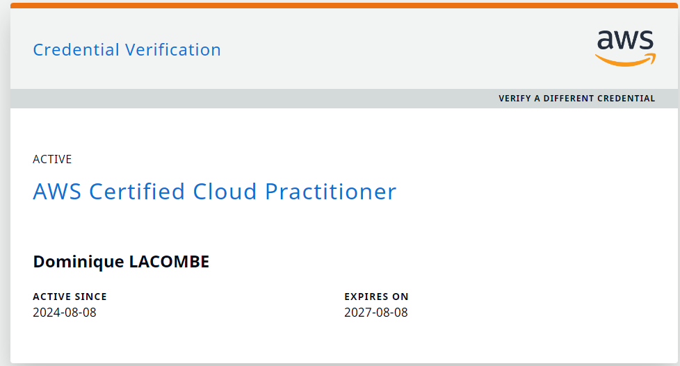 08-2024 - 08-2027 : Certification AWS Cloud Practitioner - AWS